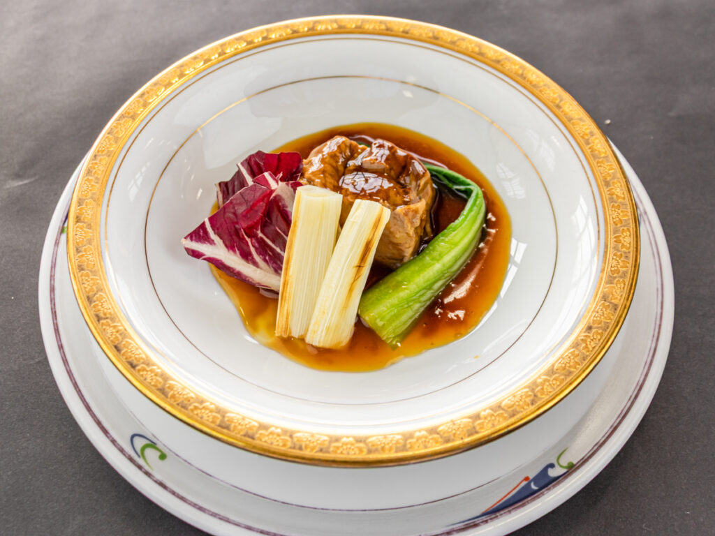 【洋皿】「牛バラ肉の柔らか煮」をお召し上がりいただけます。煮る前に、焼く・蒸す調理を経ており手間をかけた一品です。